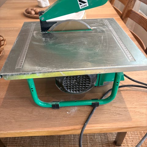 Lite brukt flis/stein kutter. Slik den er avbildet så kutter den ca 45 cm lengde men kan lengre om man tar av noe. Har stått inne i flere år ubrukt, ble kun brukt til ett bygge prosjekt.