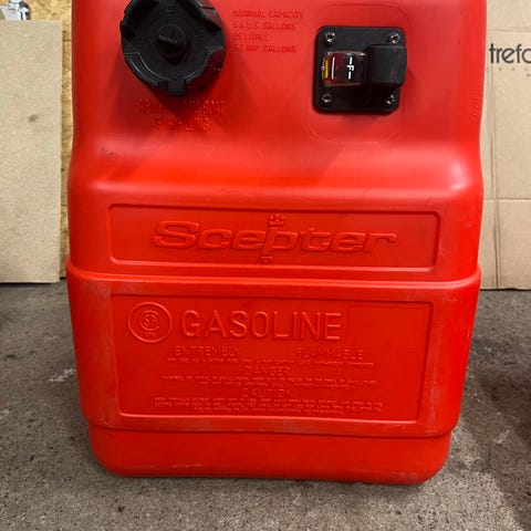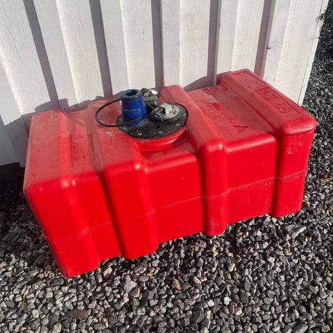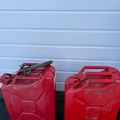 Jerrykanner, 3 stk, hver med kapasitet på 20 liter. To av kanisterne er grønne, en er rød. Designet for oppbevaring og transport av drivstoff eller væsker. Utstyrt med håndtak for enkel bæring. Må hentes.