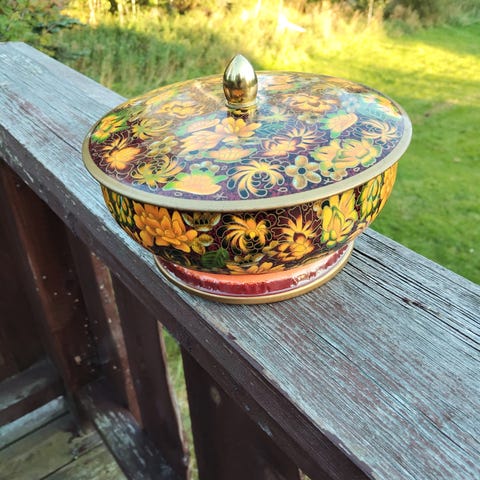Er trykket på bomulls tøy. og har noen flekker. Har ikke turt å vaske den.