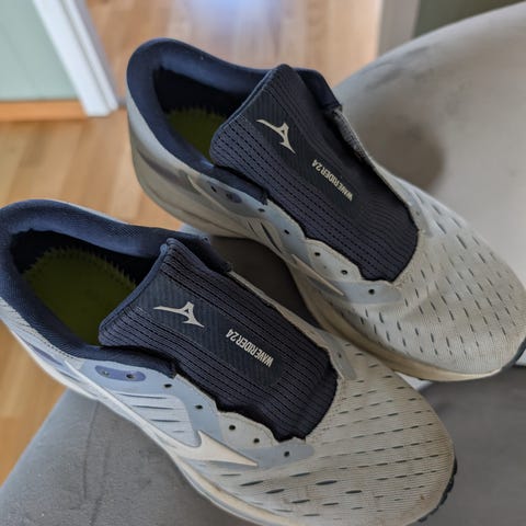 Pent brukt Mizuno Wiwe Rider 24 i str 38,5. Skoene er lite brukt, men pga at det var feil størrelse har det blitt et lite hull på begge hælene innvendig. Skoene er brukt som innesko og fremstår veldig fine.