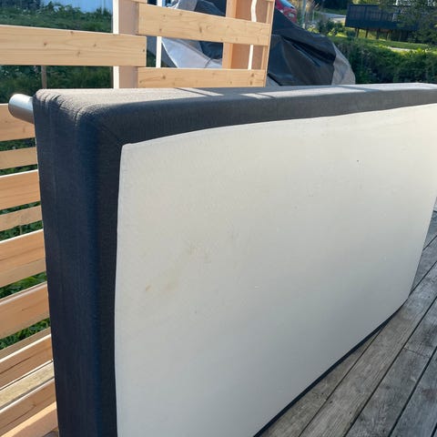 Rammemadrass 90x200x25cm samt overmadrass 5cm. Kan også selge de 2 ryggputene hvis ønskelig. Rammemadrass med eikeben kr 2000,-Overmadrass 800,- 2 stk ryggputer kr 500,- or stk. senga har stått på et gjesterom. Den har ikke vært i brukt. Beige overlast 160x260cm selges for kr 600,-