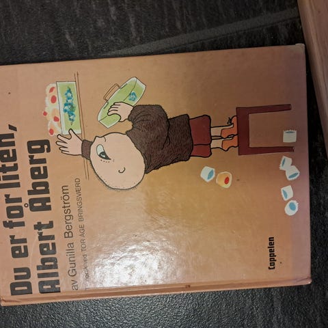 Pekebok med Albert Åberg, utgitt i 1984, selges for kr.75,- + porto. Hel og fin og uten skrift fra små " kunstnere".