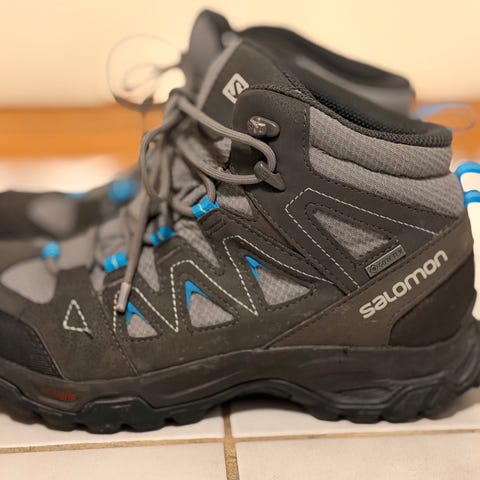 Den ene skoen mangler en hempe på ene siden (se siste bildet) men kan fint brukes uten.