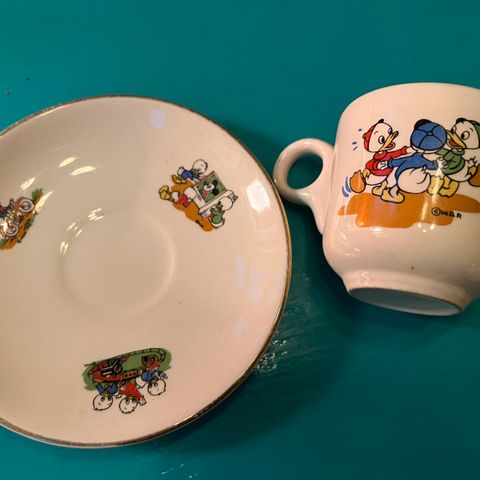 Barneservise med kopp, fat og eggeglass fra Disney. Stavanger flint. Sannsynligvis fra 50-tallet.