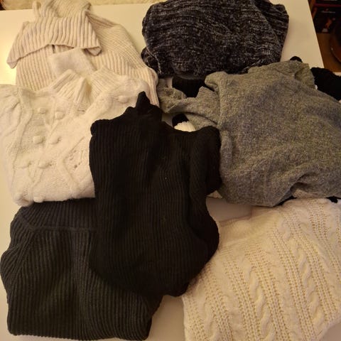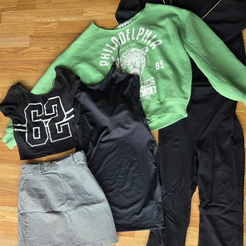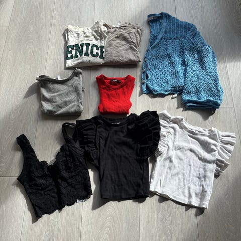 Klespakke i str. XS med 6 bukser, 1 skjorts, 2 kjoler, 3 gensre, en boblekåpe, 1 skjørt.