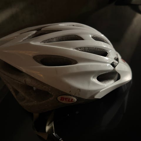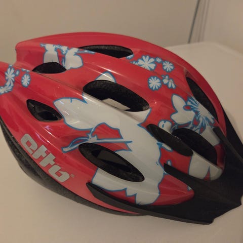 Sykkelhjelm i hvit med rosa og turkise illustrasjoner, inkludert et motiv av en bjørn og trær. Hjelmen har ventilasjonsåpninger og justerbar stropp under haken. Passer for små barn.