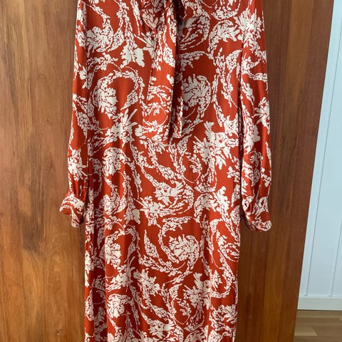 Second Female Beige kjole i størrelse M. Kjolen har et mønster med svarte prikker, lange ermer med elastiske mansjetter og en knyting foran. Lengde rett rundt kneet. Materialet er lett og passende for både hverdag, på jobb og fest. En knall fin kjole som dessverre ikke er passe til meg.