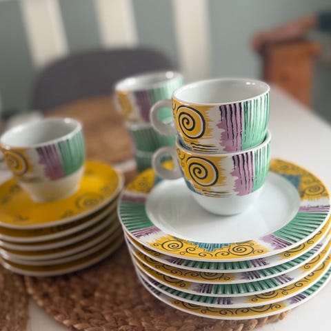 70's kaffefat Ø11,5 cm fra HKliving er laget av holdbar steingods. Dette runde kaffefatet er en del av 70's-serien og er en fargerik hyllest til kaffekulturen. Med sin rike, varme fargepalett og unike mønstre, skaper det en visuell fest som inviterer til å nyte kaffen i ekte vintage stil.