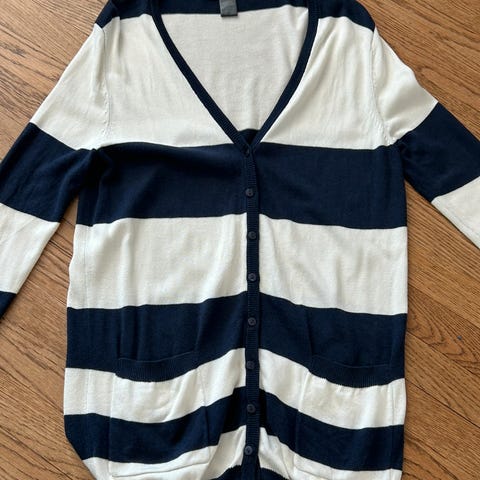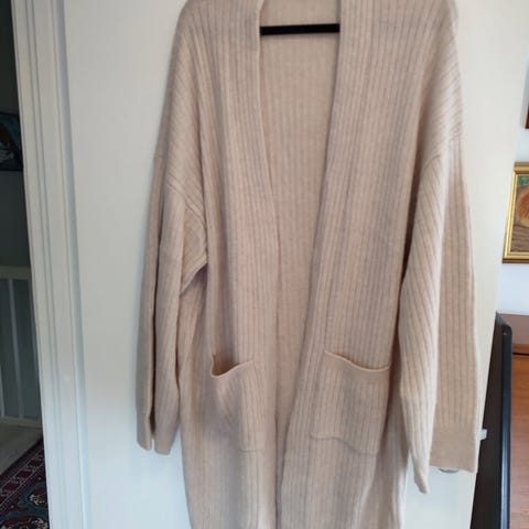 Ellos lang cardigan m/lommer str. 42/44, lys beige. Åpen i front. 97% polyester / 3% elastan. Lengde 80 cm. Helt ny og ubrukt.