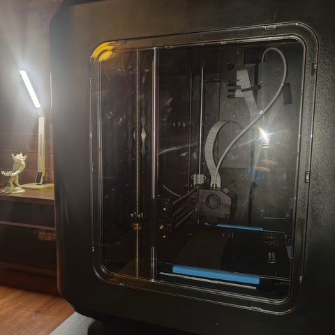 Flash forte 3D Printer med en byggeområde på 15 cm x 15 cm x 15 cm og en total volumkapasitet på 3,37 liter. Printeren har et svart og grått kabinett med transparent sidepanel for overvåkning av utskriftsprosessen. Inkluderer 2 valgfri farget filamentruller (gul, svart, beige, blå, rød, oransje) for varierende utskriftsbehov. Pakken inneholder også to sett med tilbehør eller reservedeler for vedlikehold og oppstart.