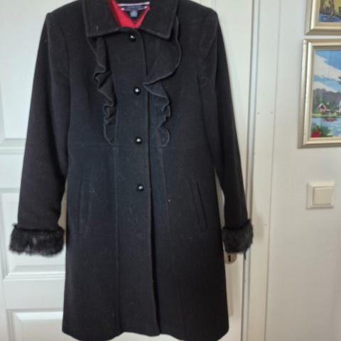 Tommy Hilfiger Tommy Jeans Annet yttertøy i svart farge, størrelse L for kvinner. Jakken har en glanset finish og en hette med pelsdetalj. Den har glidelåslommer foran og er designet for utendørs bruk.