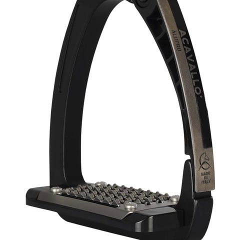 Acavallo Stigbøyle laget av svart plastmateriale med en metallfotplate utstyrt med pigger for bedre grep. Designet for å gi stabilitet og sikkerhet under ridning.