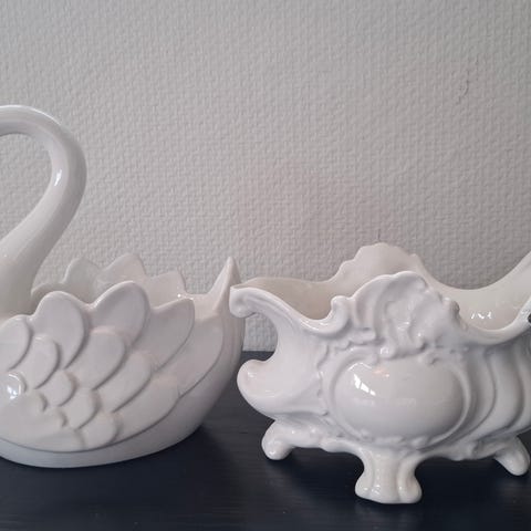 Hvit glasur. Løvehode formede hanker. Et par. Ingen nag, sprekker eller skader. Kan pakkes godt og sendes hvis ønskelig. Høyde 18 cm. Diameter 20 cm.