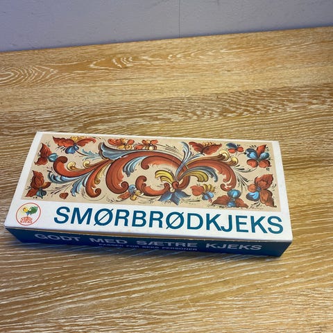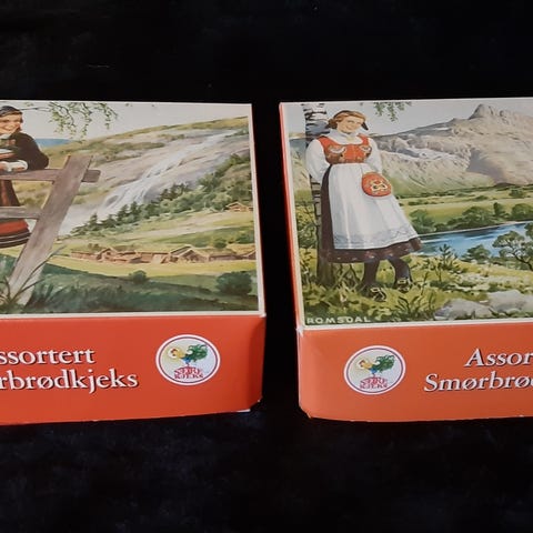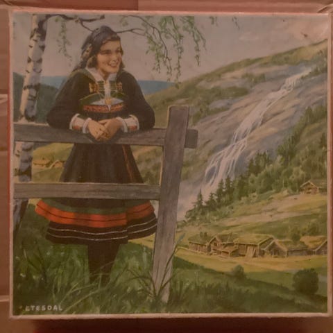 Trolig 1964. Bunad fra Valdres. Motivet minner om Slidrefjorden. 25x25cm. Assortert smørbrødkjeks. Liten skade på baksiden av boksen. Studer bildene nøye.