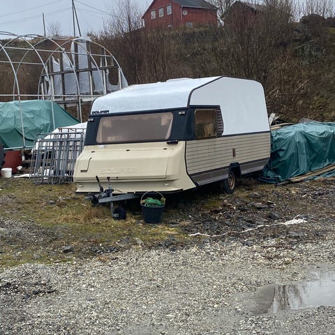Den er tom, ble brukt som hønsehus i noen mnd. Det er en del fuktighet i vogna. Den har tilhenger og fine hjul som kan kjøres/fraktes med.