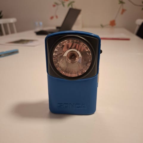 Blå metall, plast m.m. Svart tusjmerke på baksiden.