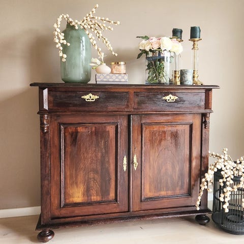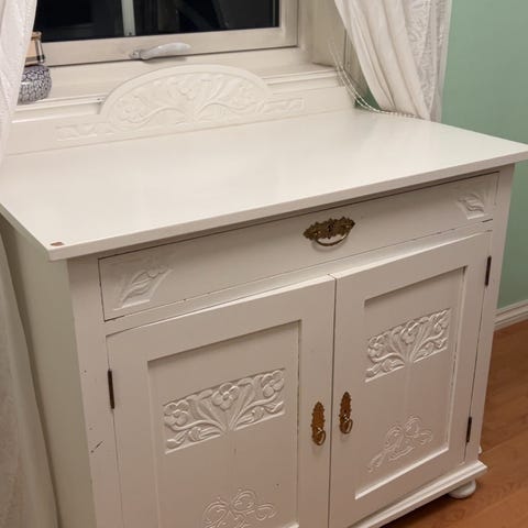 Sjarmerende vintage skap fra begynnelsen av 1900-tallet. Sjenken er laget i bjørk eller lønne, med vakre intarsiamønstre i form av diamantstjerner som gir den et unikt preg. Dreide og utskårne kanter langs rammen tilfører et klassisk og tidløst design.