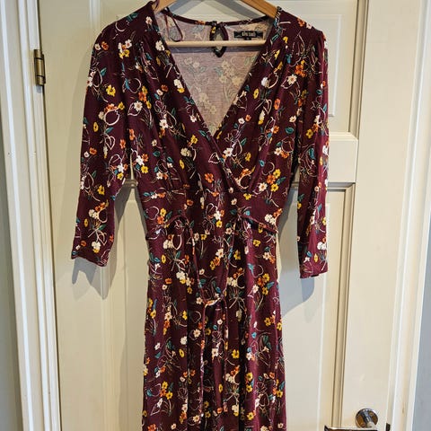 Fin, behagelig, svart kjole fra det Nederlandske merket King Louie. 100 % viskose. V-hals foran og bak. To beltehemper kan benyttes for å holde beltet som hører til kjolen på plass, men kjolen kan også fint brukes uten belte.