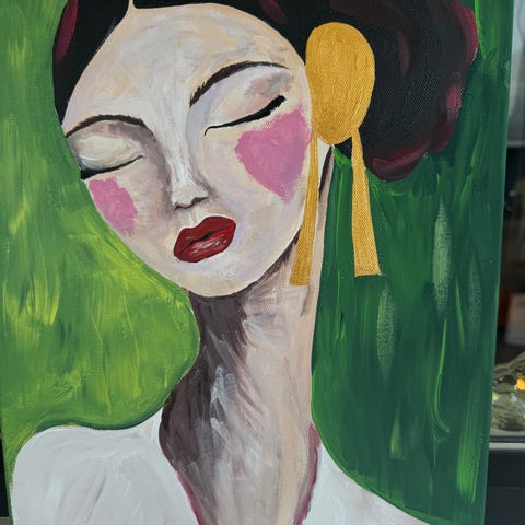 Perfekt for noen som ønsker å bringe farge, energi og eleganse inn i rommet. Kunstverket har et slående kvinneportrett, gjengitt med uttrykksfulle penselstrøk og en strålende palett av rosa, oransje, blå og grønnfarger.