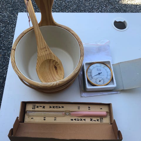 Bøtten er vanntett med et kompatibelt plastinnlegg. Timeglasset er en god timer for å unngå å bli for lenge i badstuen, mens termohygrometeret gjør det mulig å sette det optimale badstueklimaet ved å måle temperatur og fuktighet.