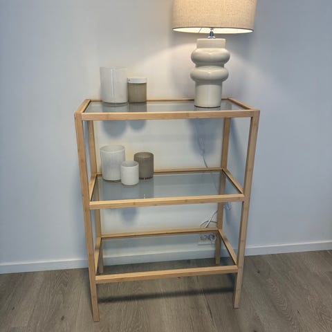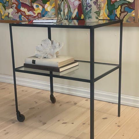 Vintage hylle/sidebord i plexiglass, tung og stødig konstruksjon. Mulig tysk eller italiensk opprinnelse, trolig 70-tallet. Veldig kul! Med dekorative messingskruer som synes gjennom glasset. Med bruksmerker, men i meget god vintage stand. Høyde 66, bredde 75, dybde 40 cm. Kan hentes eller leveres i Oslo