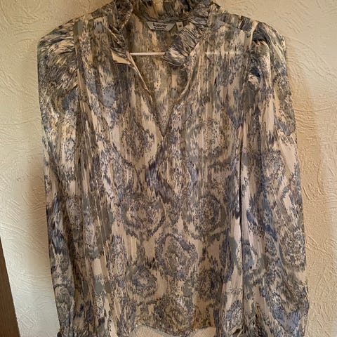 Rysjer rundt kragen og nede på blusen. Litt innsvinget og skåret litt lengre bak enn foran.