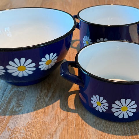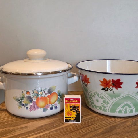 Godt brukte emaljegryter fra 70 tallet. Mulig de kan brukes selv om de er «svidde» i bunn. Eller de kan kanskje brukes til dekorasjon eller blomster potter? Tok vare på de etter vi ryddet barndomshjemmet fordi de er ganske kule. Men nå har de stått her i 10 år og aldri blitt brukt. Kan ta flere bilder om du trenger.