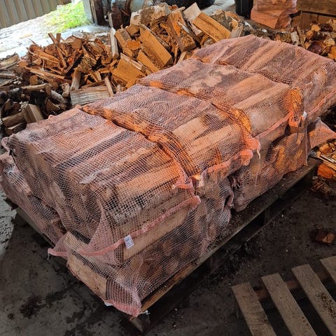 Bjørkeved i 40L sekker. Tømmeret er høgd i høst og kløyvet i starten av mars.