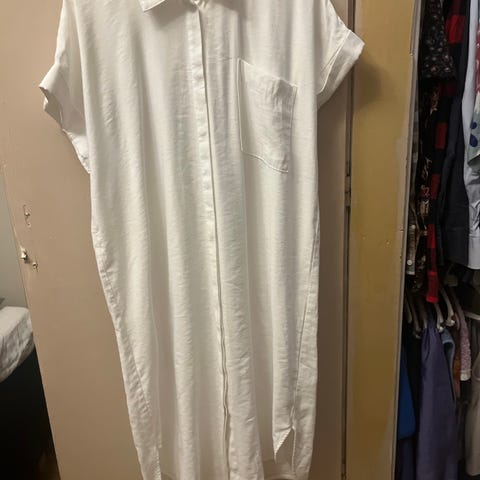 Den er one size. 109 cm lang fra bryst.