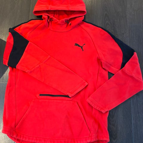 Puma hettegenser i størrelse L for herre. Genseren er rød og har hette samt kengurulomme foran. Materialet er ikke spesifisert, men genseren er designet for komfort og hverdagsbruk.