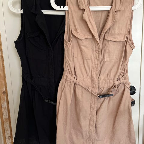 Dette er en kjole i str 42 et Dansk merke og den er kjøpt på Gulskogen senter i en motebutikk den går ned ovenfor knærne den er romselig Den faller pent på kroppen har lommer på hver side har morsomme armer med blonder og gjør kjolen morsom den har en liten knapp man åpner for og ta den av og på seg Du kan pynte den opp med et skjerf eller et smykke og ta en veske til og noen sko og er klar til en fest kveld med en jakke eller en genser den er i organisk Bomull 100prosent