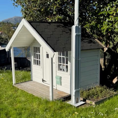Selges: solid og flott lekestue i klassisk sveitserstil, størrelse 2 x 3 meter. Huset er ferdigmalt og klart til bruk, med kvist på taket som gir ekstra sjarm.