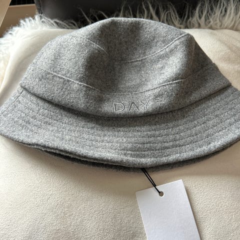 Hatt-bøtte hatt fra Day Birger Mikkelsen. Fargen er beige, kamelfarget. Størrelse L/XL. Den er i ull og polyester. Innvendig for er bomull. Vaskes på 30 grader. Størrelsen er L/XL. En fin og klassisk, bøttehatt for høst/vinterdager. Ikke brukt. Merkelapp henger på.