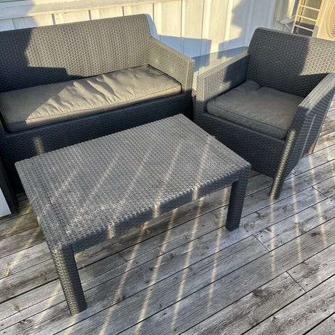 Utemøbelsett bestående av hjørnesofa og bord laget i grå kunstrotting. Settet inkluderer en hjørnesofa med flettet design og et rektangulært bord med solid overflate. Materialet er værbestandig og egnet for utendørs bruk. Settet passer for uteområder som terrasse eller veranda. Små skade som kan ses på bildet.