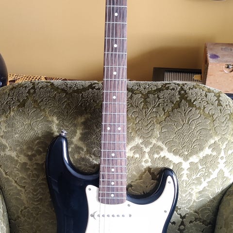 Overraskende god Stratocaster satt opp med nye 0,10 strenger. Justert, intonert og spiller godt. God nybegynnergitar eller modde-plattform. Satin finish på en veldig god c-formet hals. God hals!