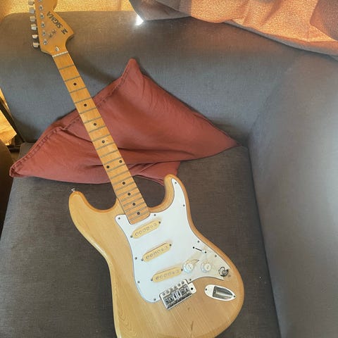 Strøken Woodrock Stratocaster selges billig for kr 1500 Kan evt byttes i noe gitarrelatert, en kvalitets pedal (Prince of Tone, Tweed Deluxe-pedal)Marshall Class 5 eller annen liten øveforsterker f.eks. Mellomlegg finner vi ut av.