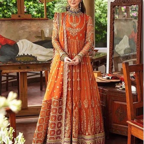 Kjolen er utsmykket med intrikate gull- og rødtonede broderier, med matchende dupatta (sjale) med kantbroderier og dusker. Perfekt til bryllup, eid eller festlige anledninger. Har brukt en gang på et bryllup fest