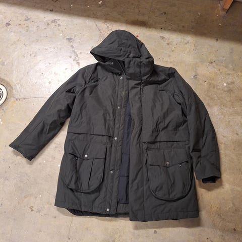 Chevalier bomull/polyester jakke i small, er stor i str. Passer nesten til meg på 184cm å 85 kilo😄 Lydsvak materiale og mindre klam å allround enn Goretexs klær.