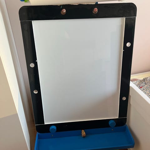 Gulvstaffeli med krittavle og whiteboard selges. Må hentes. Staffeliet er lite brukt og i god stand, men har en del tegnemerker på seg.