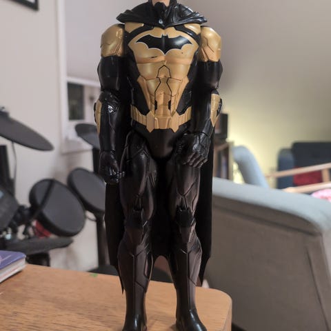 Batman actionfigur laget av plast. Figuren er svart med gule detaljer og har bevegelige armer. Passer som samlerobjekt eller leketøy.