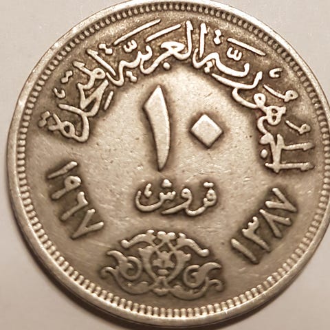 Egypt 20 Piastres mynt fra 1964 laget av messing. Mynten har arabiske inskripsjoner og dekorative mønstre. Diameter og vekt ikke spesifisert. Passer for samlere av historiske mynter.