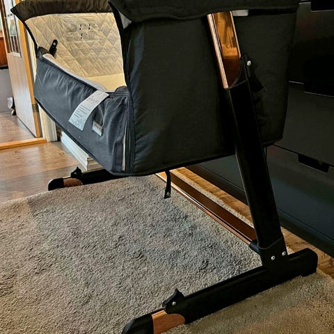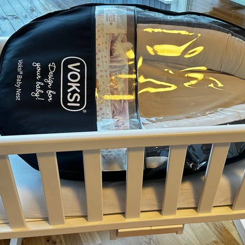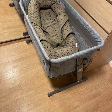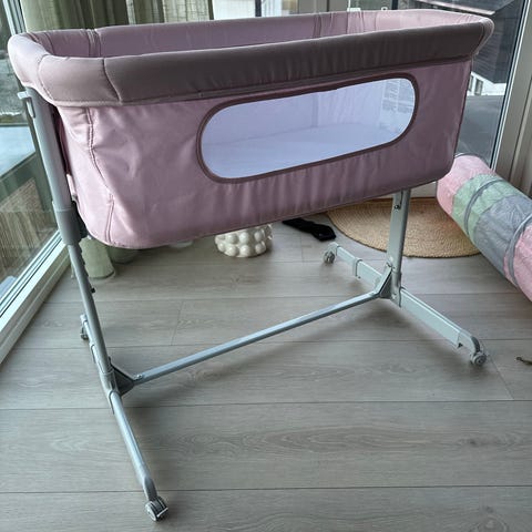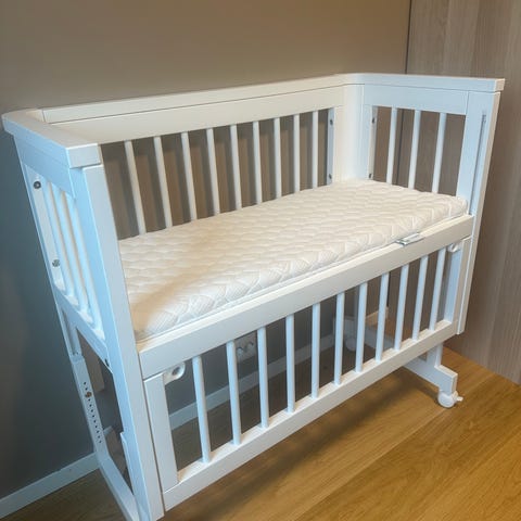 Troll bedside crib i hvit farge. Laget for trygg bruk ved siden av voksen seng. Nærmest ubrukt helsemadrass medfølger om ønskelig.