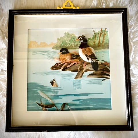 3D høstbilde viser et fossefall omgitt av trær med røde høstfarger. Bildet har en rolig naturmotiv med innsjø og fjell i bakgrunnen. Ramme i tre er inkludert.