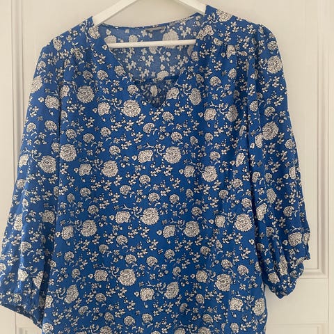 Days Like This bluse str. L, blålilla, blomstret. 3/4 arm. Behagelig stoff i polyester. Lite brukt. Lengde 70 cm. Armhule til armhule 58 cm.