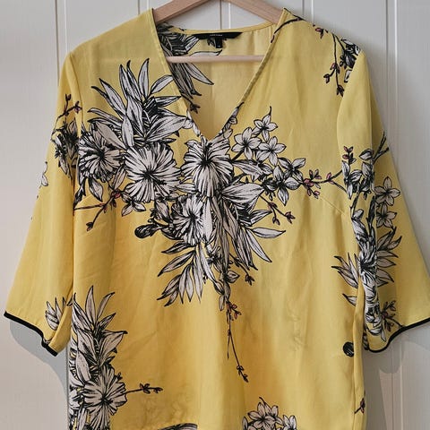 Vero Moda bluse XL, gul, blomstret. Kort arm. Veldig lite brukt, fremstår som ny. Lengde 64 cm. Armhule til armhule 58 cm.