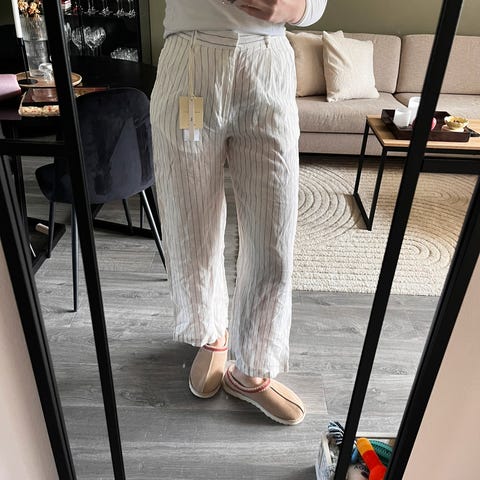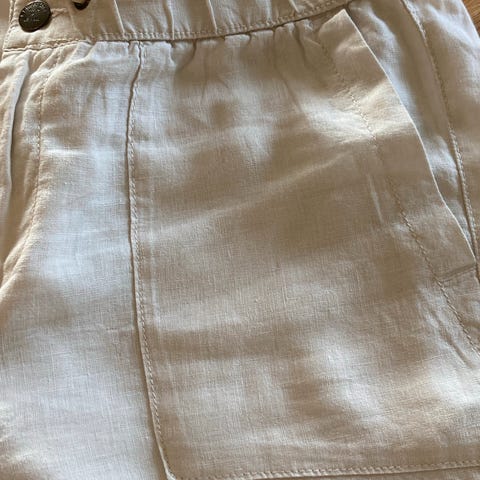 Buksen er baggy i fasongen og har høyt liv. Den er i tung behagelig lin, så faller fint.
