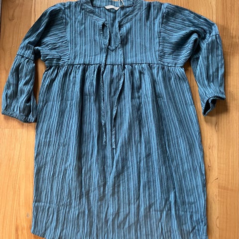 En fin tunika/kjole i et lett tynt matriale. Den har to lange denimsnorer som skal snurres flere ganger i midjen. Går ned til rett over knærne ( jeg er 167cm høy).Tøff over en jeans eller tights. Det har vært en av mine favoritt klesplagg.