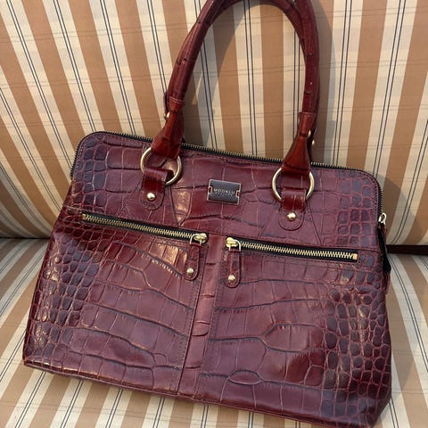 Liz Claiborne-vesken i faux-krokodilleskinn. Den strukturerte siluetten, den skinnende røde patentfinishen og de luksuriøse gullfargede beslagene gjør den til et statement-plagg for enhver garderobe. Denne skuldervesken representerer tidløs eleganse - perfekt for alle som kanaliserer retro-revival, stille luksus eller ettertraktet Y2K stil. Enten du skal ut til brunsj, på shoppingtur eller på kontor - gir denne vesken en polert holdning med retro-sjarm og ‘splash’ av farge.