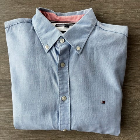 Helt ny linskjorte med kort arm fra Tommy Hilfiger til herre i str L. Marineblå. Ny pris: 1199 kr. Selges 600 kr.