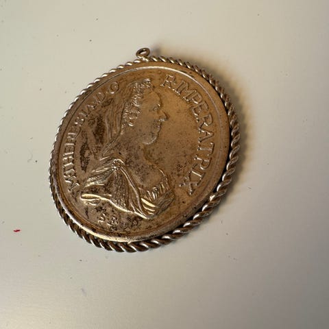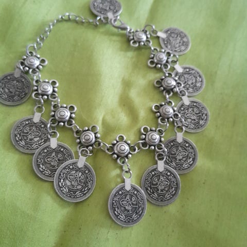 Armbånd av mynter av ubestemmelig opprinnelse.Ser ut som antikisert sølv.Ingen stempler,og gullsmeden sier det ikke er sølv,så antagelig sølvplett?Har sikkerhetslenke så det er jo litt pussig på uekte smykke.